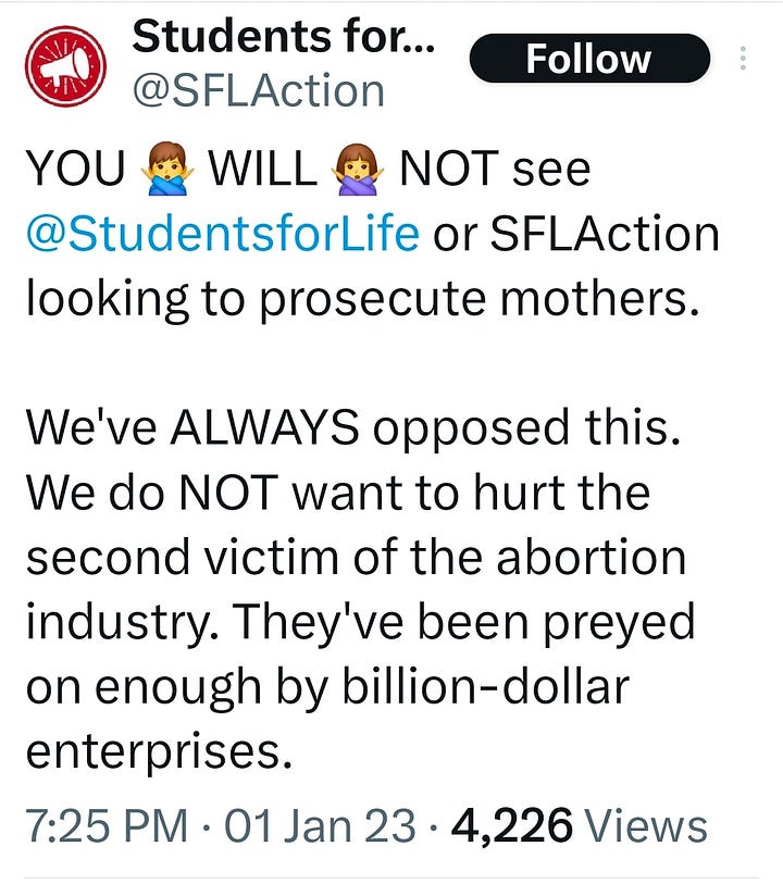In a January 2023 post on social media, SFLAction said, “YOU 🙅♂️ WILL 🙅♀️ NOT see @StudentsforLife or SFLAction looking to prosecute mothers.” — Yet, three years later, that's exactly what SFLA and SFLAction are doing.