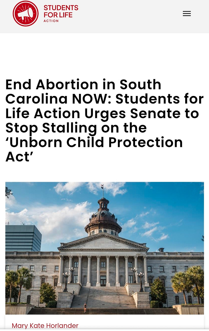 Students for Life of America (SFLA) has endorsed a bill introduced in the South Carolina Senate and is lobbying for its passage. The endorsement was announced through SFLA's dark money arm Students for Life Action (SFLAction).