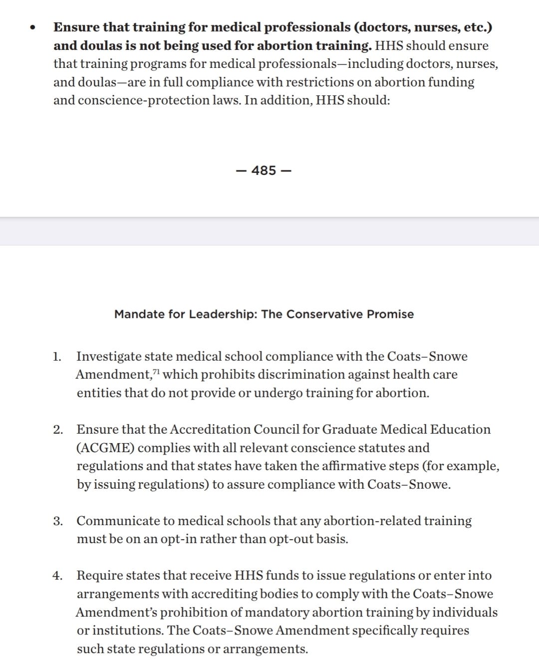 The Heritage Foundation’s Project 2025 Mandate for Leadership lays out ways of attacking access to abortion training and bringing institutions into alignment with anti-abortion ideology (see the image below).